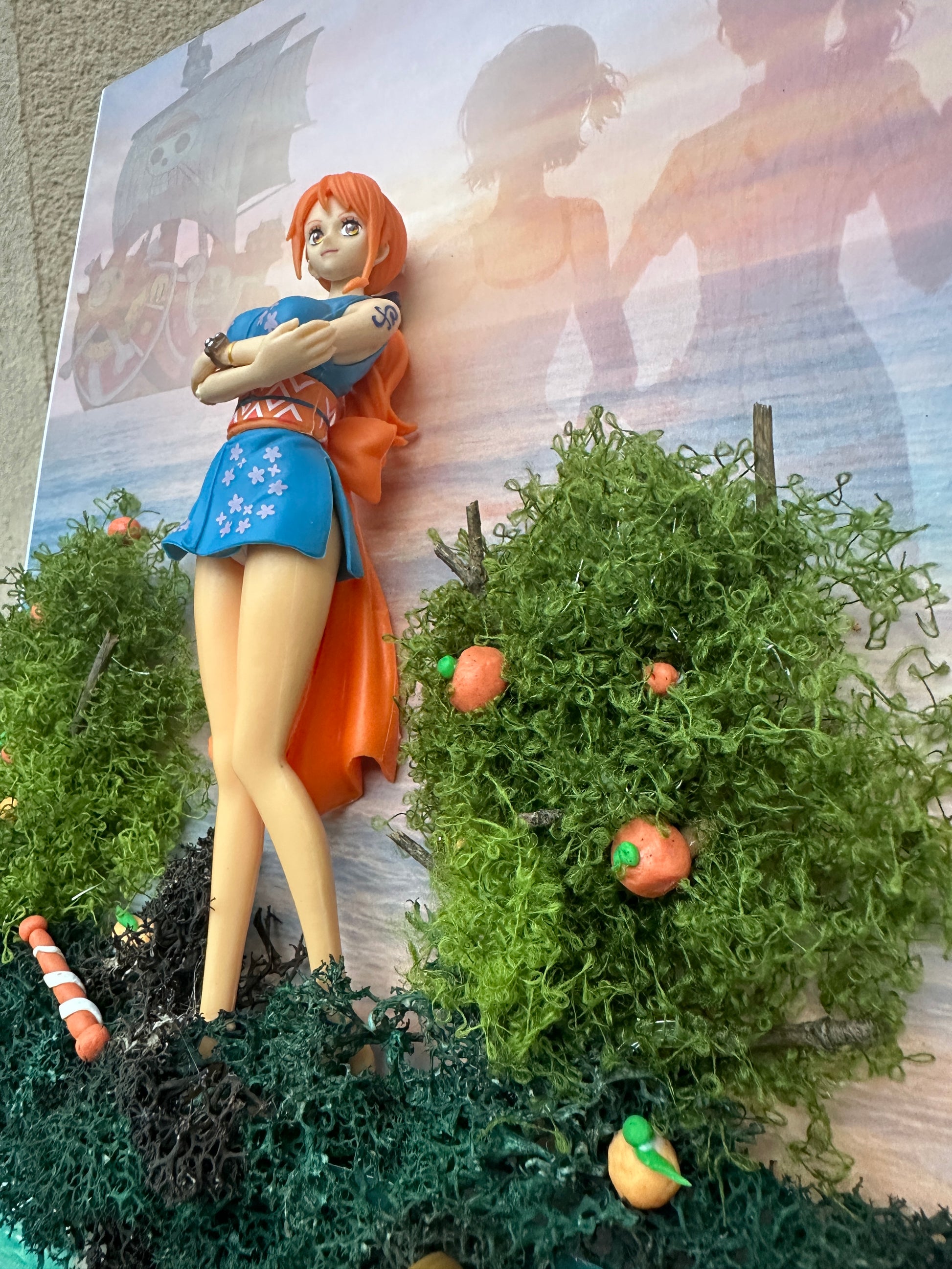 Plongez dans l’univers de Nami, la navigatrice emblématique de One Piece, à travers ce tableau diorama 3D entièrement fait main.